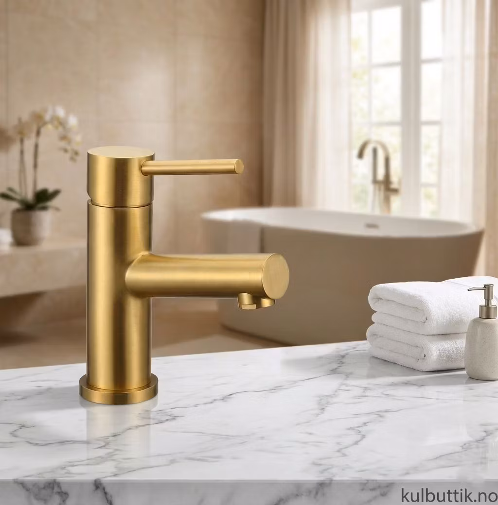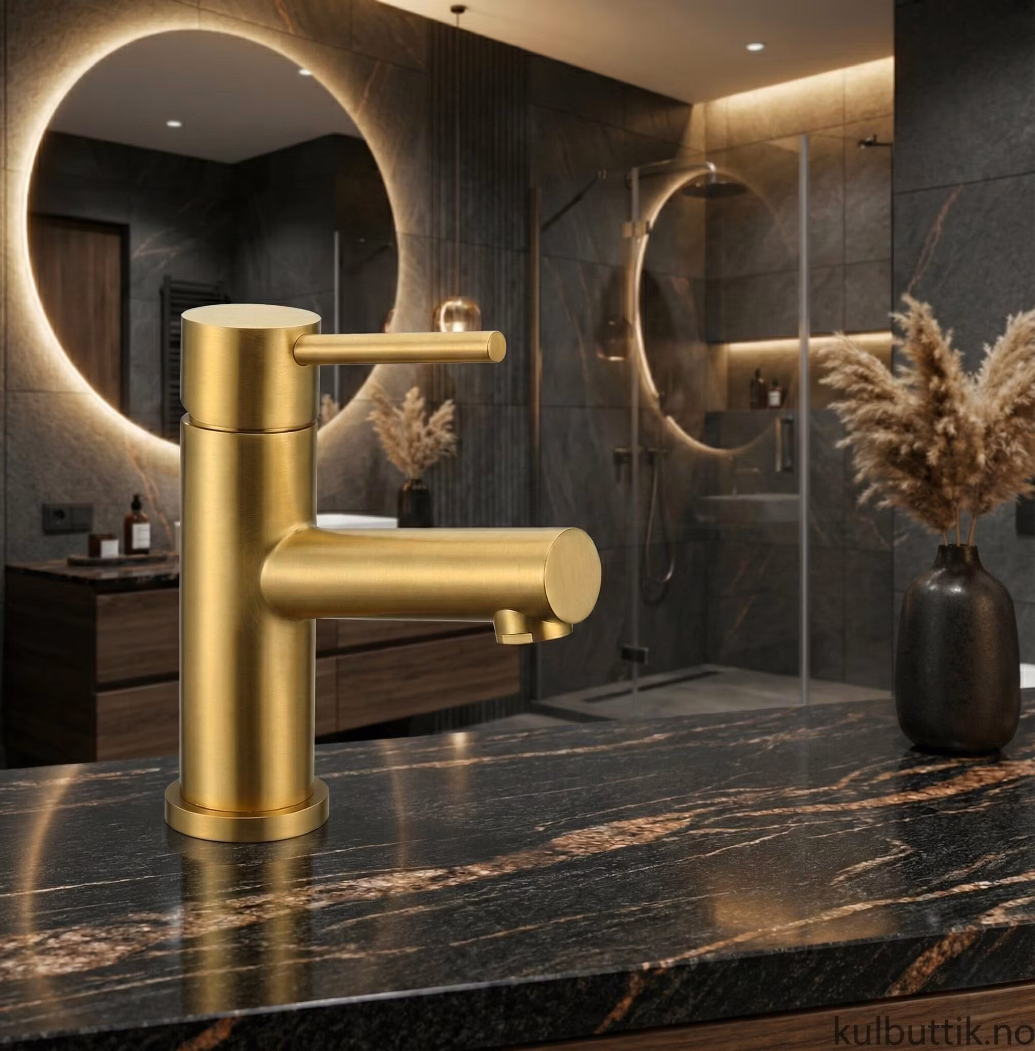 Gi baderommet ditt et eksklusivt løft med Azur 1 servantbatteri i børstet gull. Den matte overflaten gir et moderne, dempet uttrykk som oser av kvalitet, samtidig som den er mer tilgivende mot fingermerker enn blanke overflater.